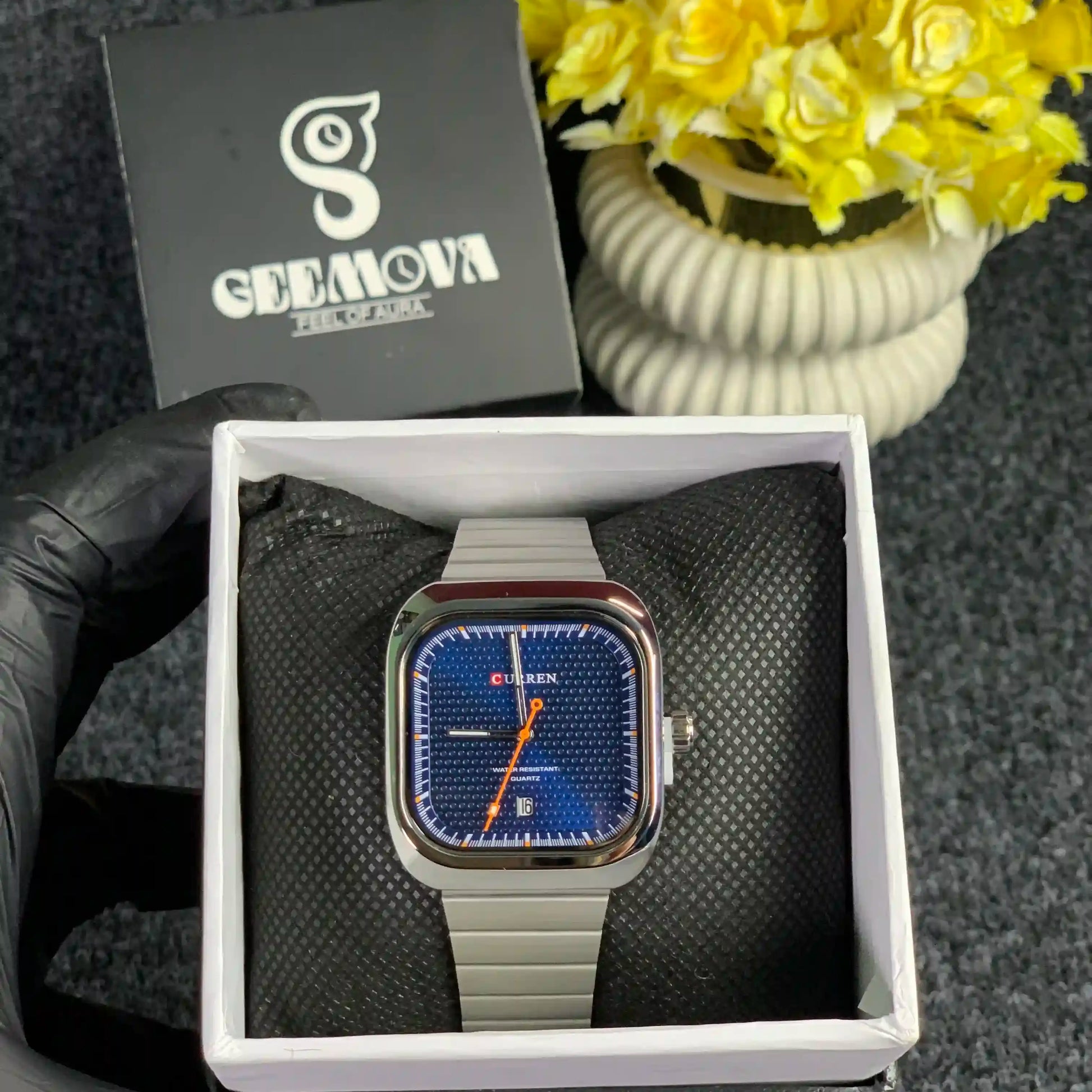 Make a powerful statement with the Curren M8460. Featuring a unique square-case design and a stunning textured blue dial, this timepiece is engineered for the modern man who values both style and durability.